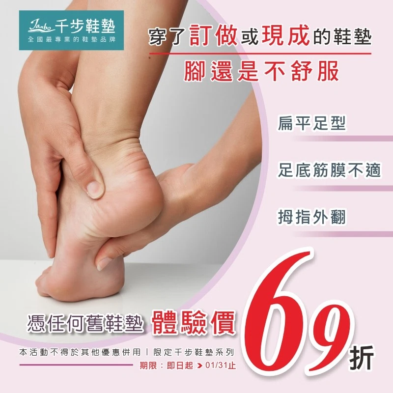 千步鞋墊 以足體力學為開發基礎,從腳底足態、足壓分析、從學齡孩童到成年人,依不同年齡、腳的尺寸、體重的差異性,開發多款不同需求的機能鞋墊,並針對【扁平足型、足底筋膜、足弓塌陷、拇指不適】等,足底的問題,適配專用的機能鞋墊。【Janbo 千步鞋墊】與國家級研究院共同合作開發全國獨一【精準鞋墊選配量測儀】秒測足壓型態,讓每個人都可以配到一雙真正適合屬於自己的緩壓、舒適、緩震、平穩的好鞋墊!