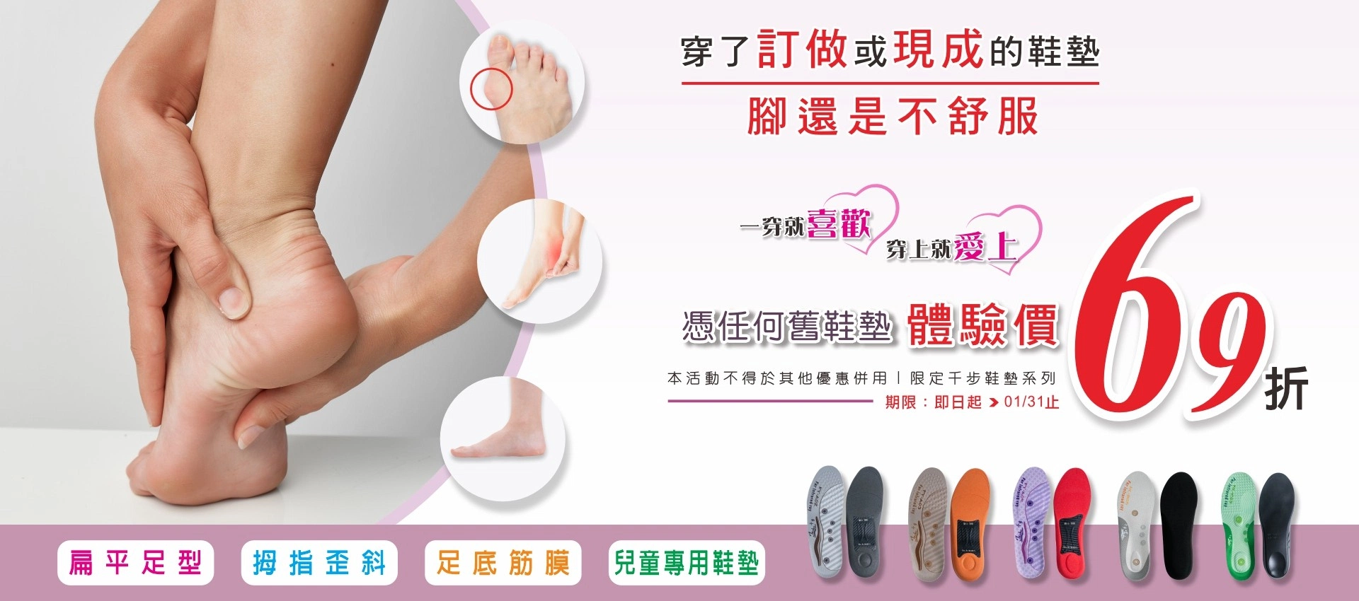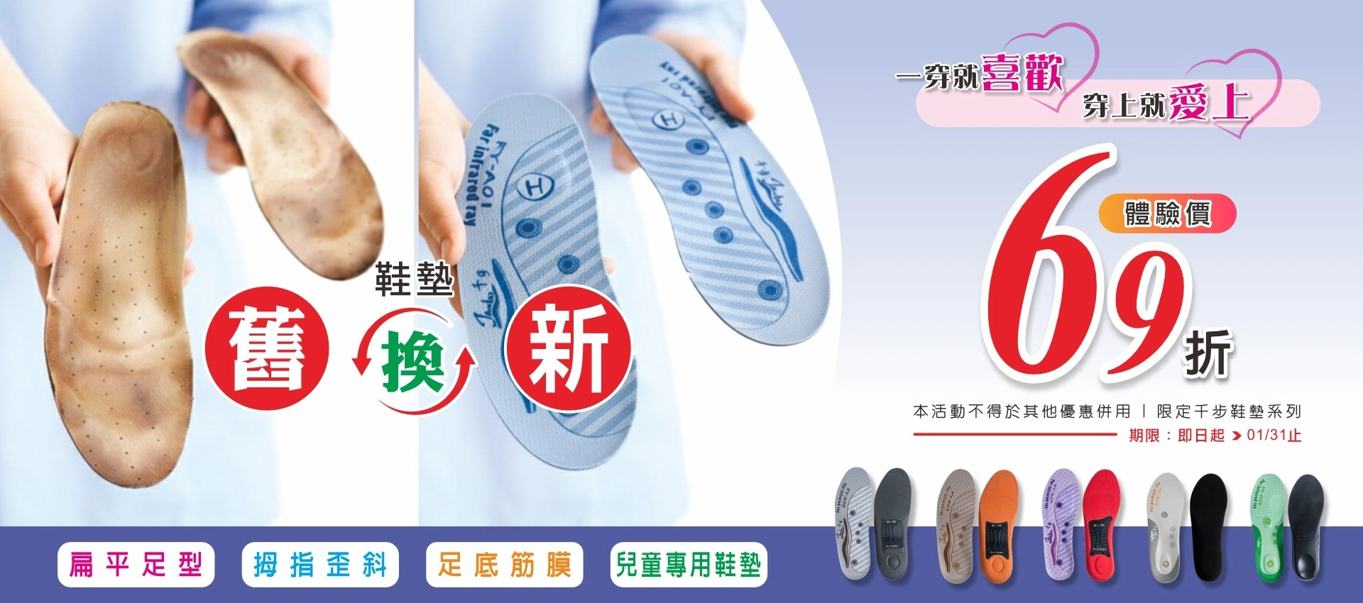 千步鞋墊 以足體力學為開發基礎,從腳底足態、足壓分析、從學齡孩童到成年人,依不同年齡、腳的尺寸、體重的差異性,開發多款不同需求的機能鞋墊,並針對【扁平足型、足底筋膜、足弓塌陷、拇指不適】等,足底的問題,適配專用的機能鞋墊。【Janbo 千步鞋墊】與國家級研究院共同合作開發全國獨一【精準鞋墊選配量測儀】秒測足壓型態,讓每個人都可以配到一雙真正適合屬於自己的緩壓、舒適、緩震、平穩的好鞋墊!